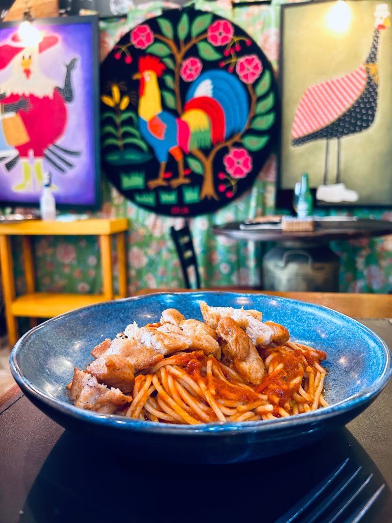 Experimentamos um risoto, que estava saboroso, e também um prato do menu infantil — espaguete com frango — que agradou bastante. No entanto, o buffet de feijoada deixou a desejar. A salada não estava sendo reposta e a pururuca, além de estar dura, também não foi renovada.